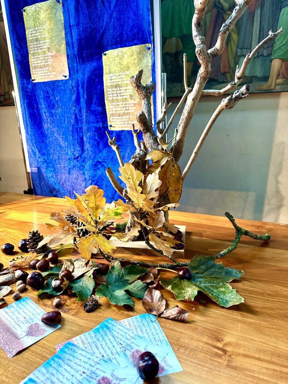 Achter in de kerk, bij de Antoniusdeur, hebben Els en Loes weer een nieuwe geloofstafel ingericht….