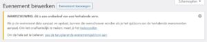 Boven in het scherm staat een waarschuwing en de mogelijkheid om een individuele viering los te koppelen. Dat is verstandig als elke viering eigen informatie gaat bevatten. Is dat niet het geval, en worden de evenementen alleen voor registratie / aanmelding gebruikt, dan is het beter om de koppeling te handhaven. Mocht later bijvoorbeeld de begintijd van de vieringen veranderen, of het aantal beschikbare plaatsen, dan kan dat in één keer voor alle gekoppelde toekomstige vieringen worden aangepast.