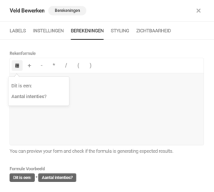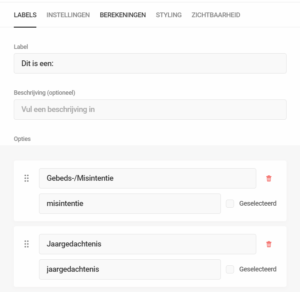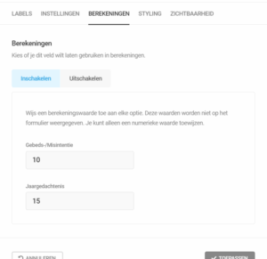 Hier is van het veld “Dit is een:” een rekenveld gemaakt, dat samen met het aantal intenties het te betalen bedrag bepaalt.