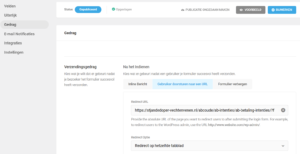 Als na het verzenden van het formulier de bezoeker een betaling moet doen, dan wordt dat gestuurd door “Gebruiker doorsturen naar een URL” op de Gedragstab.