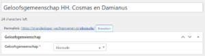 Voorbeeld: elke geloofsgemeenschap heeft een eigen pagina om een intentie aan te vragen. De pagina is hetzelfde, alleen het formulier is anders (e-mails naar lokale e-mailadressen). Om de slug uniek te maken laten we de slug voorafgaan door twee letters van de geloofsgemeenschap, gevolgd door een “-“. Voorbeeld: ab-intenties (waarbij ab staat voor Abcoude).