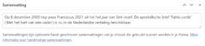 Aan een bericht kan ook een samenvatting worden toegevoegd. Als die niet wordt toegevoegd zullen nl. de eerste 20 woorden worden getoond, gevolgd door […], als teken dat er meer tekst is. Door de samenvatting in te vullen kan men zelf bepalen wat wordt getoond.