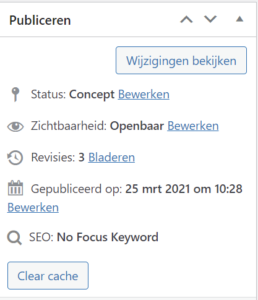 De waarschijnlijke oplossing: Clear cache. Door op de knop “Clear cache” te klikken wordt de pagina of het bericht uit het geheugen van de browser en van de server verwijderd, zodat deze weer op basis van de nieuwe situatie wordt getoond.