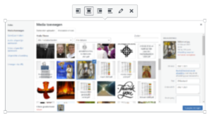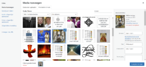 Met de knop “Media toevoegen” wordt de media-bibliotheek geopend. Daar kan een media bestand – meestal een afbeelding of een pdf – worden gekozen, en indien nodig eerst worden geüpload.